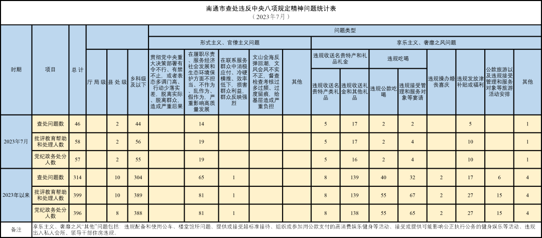 为掌握全市贯彻落实中央八项规定精神情况,南通市纪委在各县(市、区)、市级机关、市属单位建立了落实中央八项规定精神月报制度。2023年7月,全市查处违反中央八项规定精神问题情况如下: