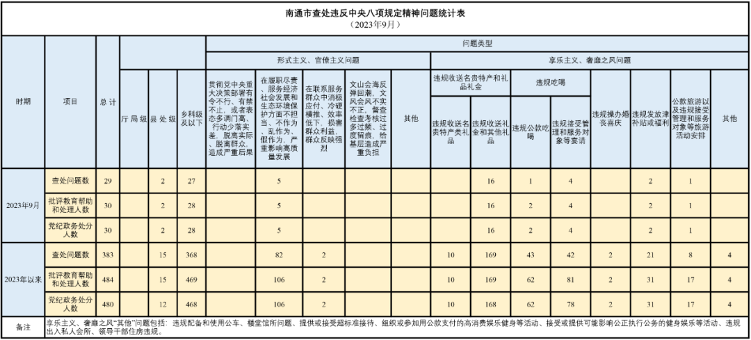 为掌握全市贯彻落实中央八项规定精神情况,南通市纪委在各县(市、区)、市级机关、市属单位建立了落实中央八项规定精神月报制度。2023年9月,全市查处违反中央八项规定精神问题情况如下: