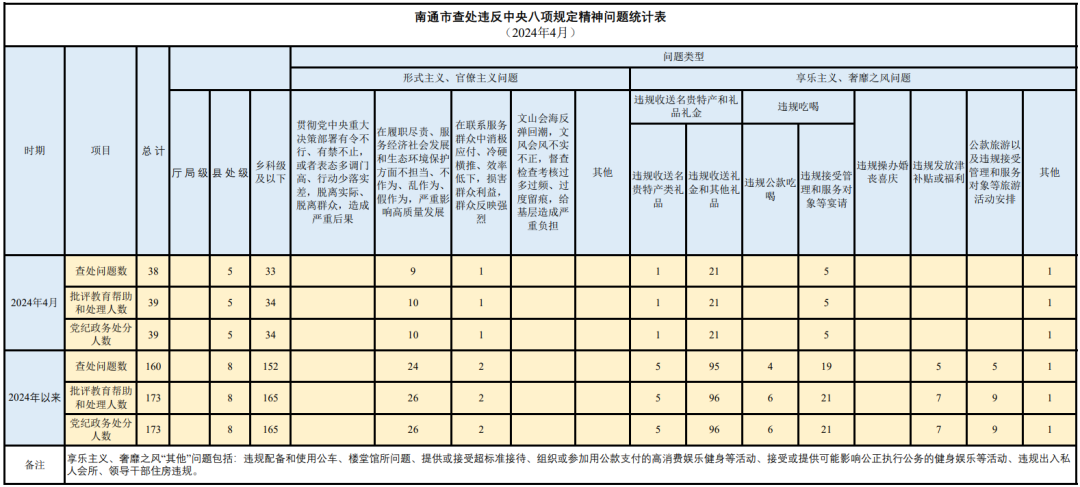 为掌握全市贯彻落实中央八项规定精神情况,南通市纪委在各县(市、区)、市级机关、市属单位建立了落实中央八项规定精神月报制度。2024年4月,全市查处违反中央八项规定精神问题情况如下: