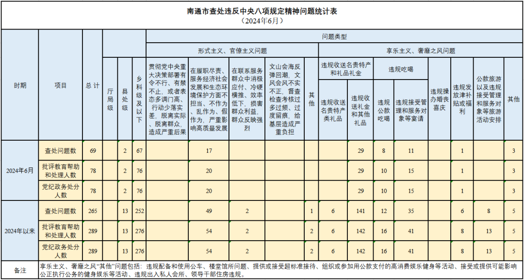 为掌握全市贯彻落实中央八项规定精神情况,南通市纪委在各县(市、区)、市级机关、市属单位建立了落实中央八项规定精神月报制度。2024年6月,全市查处违反中央八项规定精神问题情况如下: