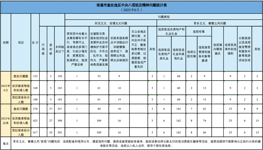 2025年6月,全市共查处违反中央八项规定精神问题153起,批评教育和处理168人,其中给予党纪政务处分168人。从问题类型看,查处形式主义、官僚主义问题68起、批评教育和处理79人,查处享乐主义、奢靡之风问题85起、批评教育和处理89人。从人员级别看,批评教育和处理县处级干部3人、乡科级及以下人员165人。
