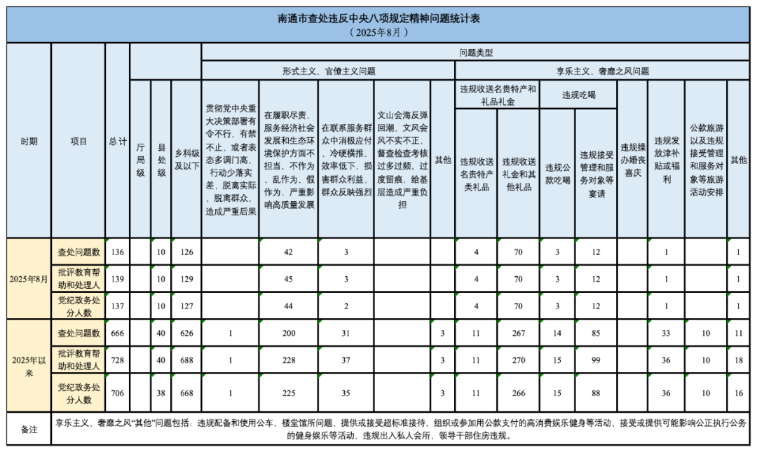 2025年8月,全市共查处违反中央八项规定精神问题136起,批评教育和处理139人,其中给予党纪政务处分137人。从问题类型看,查处形式主义、官僚主义问题45起、批评教育和处理48人,查处享乐主义、奢靡之风问题91起、批评教育和处理91人。从人员级别看,批评教育和处理县处级干部10人、乡科级及以下人员129人。
